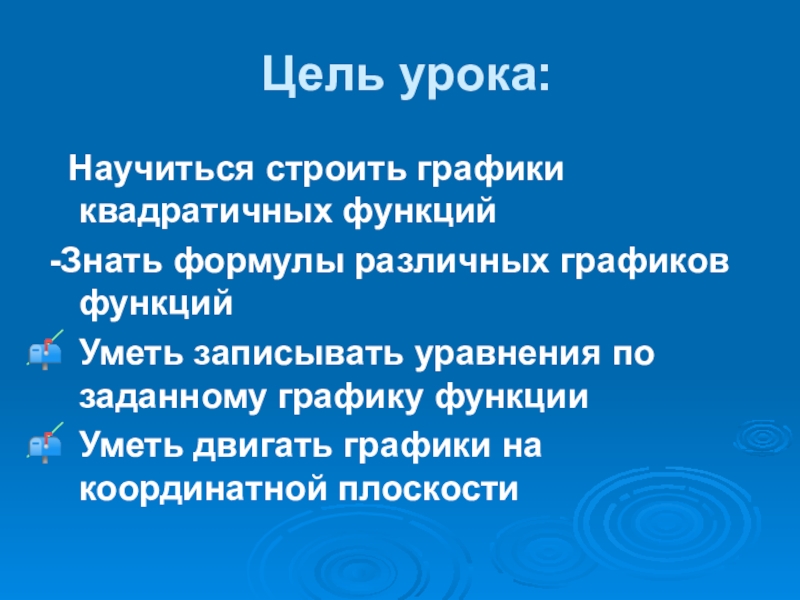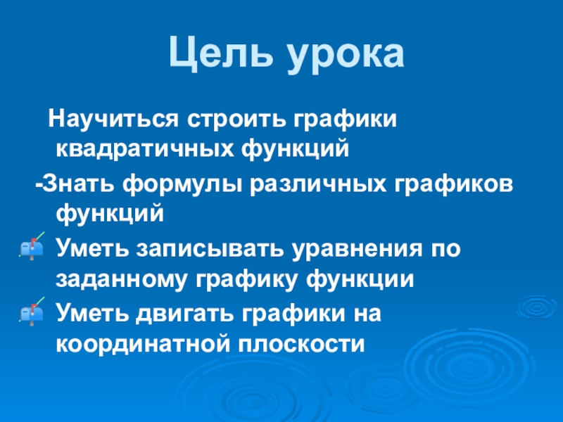 Цель урока: Научиться строить графики квадратичных функций-Знать формулы различных графиков функцийУметь записывать уравнения по заданному графику функцииУметь двигать графики на координатной плоскости