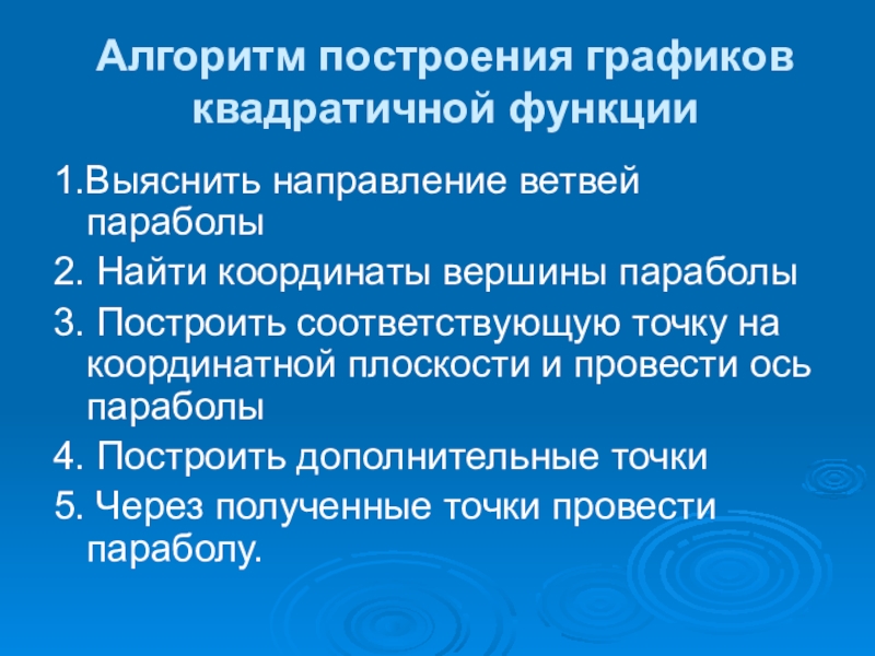 Алгоритм построения графиков квадратичной функции1.Выяснить направление ветвей  параболы2. Найти координаты вершины параболы3. Построить соответствующую точку на
