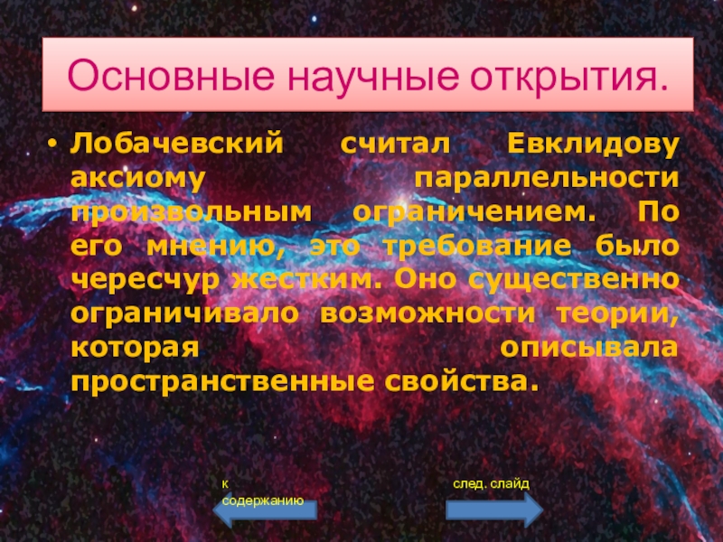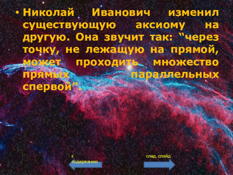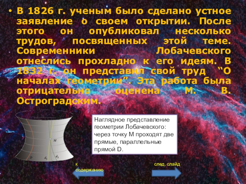 Наглядное представление геометрии Лобачевского: через точку M проходят две прямые, параллельные прямой D.
