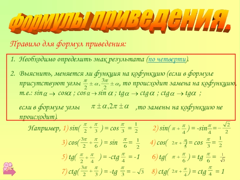 7) ctg( ) = -tg = 8) ctg( ) = ctg = 1