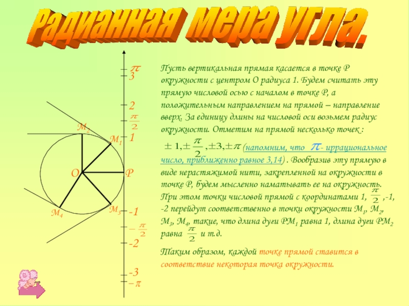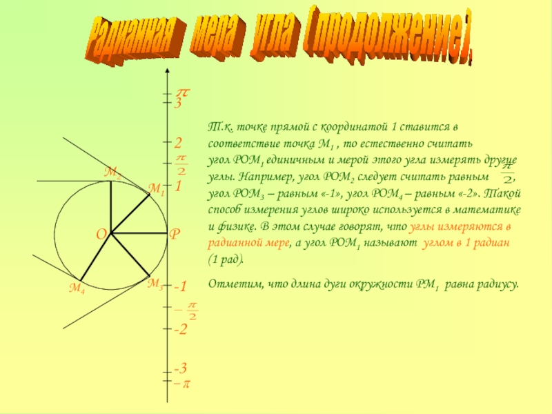 Т.к. точке прямой с координатой 1 ставится в соответствие точка М1 , то естественно считать угол РОМ1 единичным и мерой этого угла измерять другие углы. Например, угол РОМ2 следует считать равным , угол РОМ3 – равным «-1», угол РОМ4 – равным «-2». Такой способ измерения углов широко используется в математике и физике. В этом случае говорят, что углы измеряются в радианной мере, а угол РОМ1 называют углом в 1 радиан (1 рад).