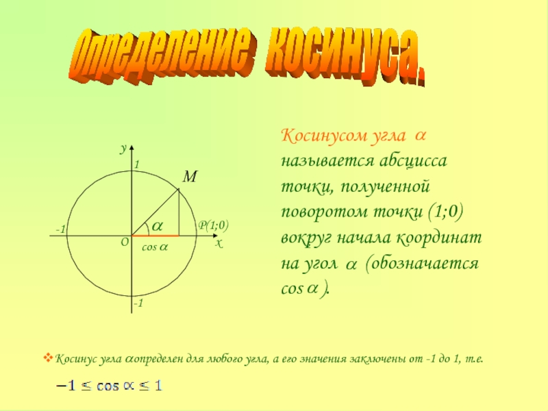 Косинус угла определен для любого угла, а его значения заключены от -1 до 1, т.е.
