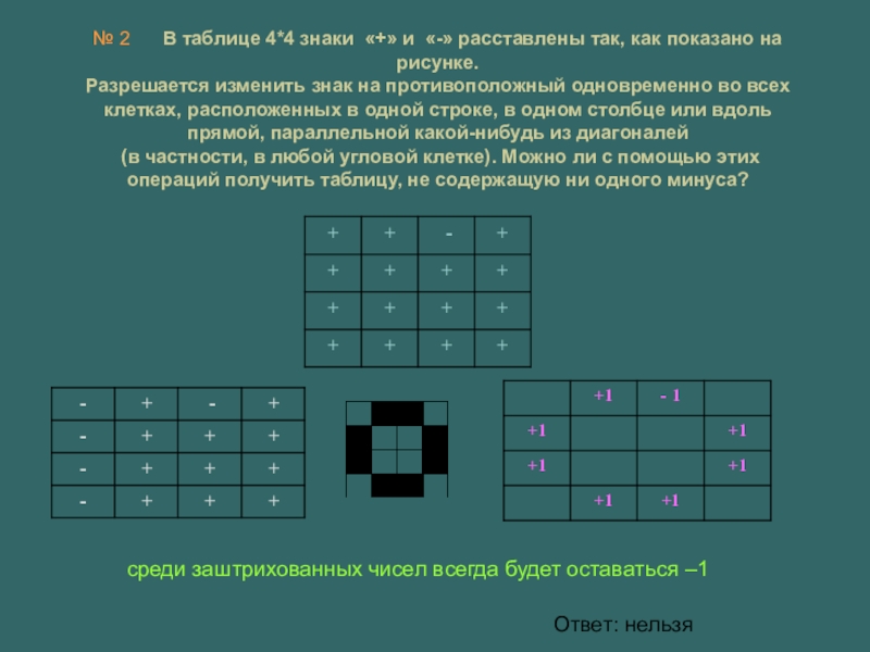 Инвариантом будет произведение чисел, стоящих в чёрных клетках. И раз оно равно числу –1, то нельзя получить таблицу, не содержащую ни одного минуса.