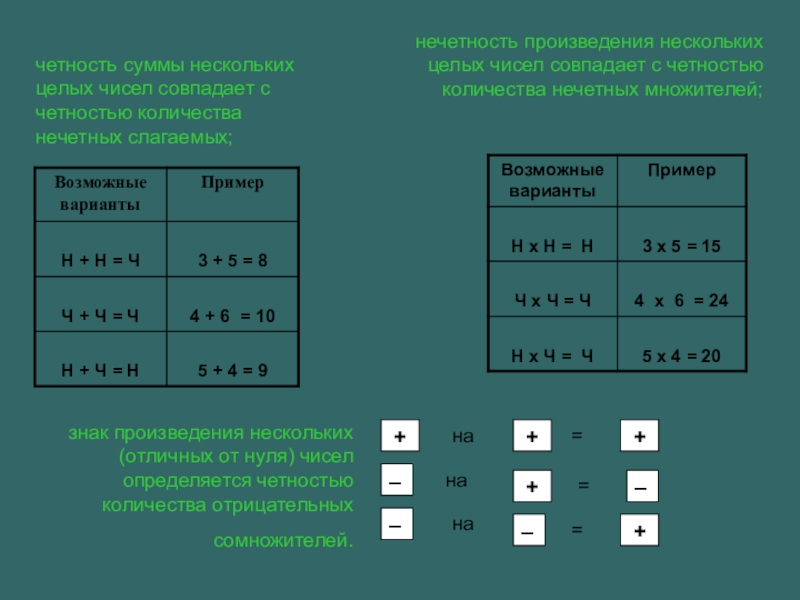 знак произведения нескольких (отличных от нуля) чисел определяется четностью количества отрицательных сомножителей.