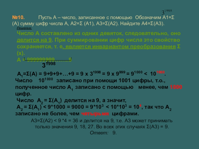 Число А составлено из одних девяток, следовательно, оно делится на 9. При суммировании цифр числа это свойство сохраняется, т. е. является инвариантом преобразования Σ(х).