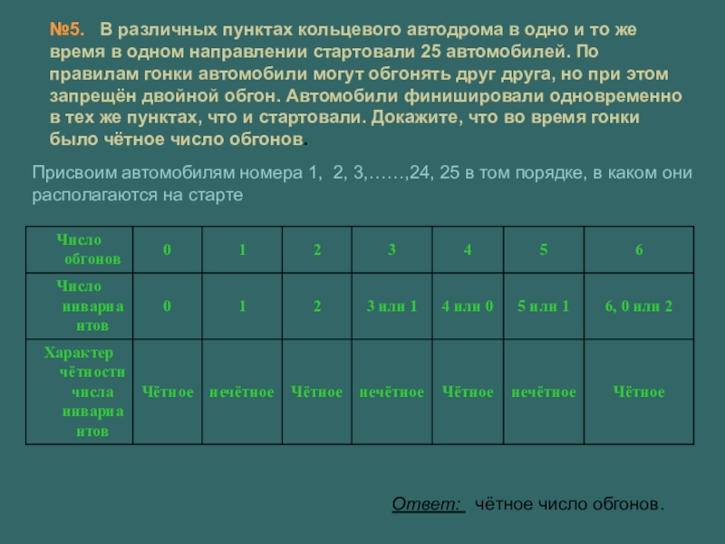 Присвоим автомобилям номера 1, 2, 3,……,24, 25 в том порядке, в каком они располагаются на старте