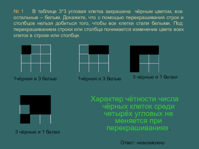№ 1 В таблице 3*3 угловая клетка закрашена чёрным цветом, все остальные – белым. Докажите, что с помощью перекрашивания строк и столбцов нельзя добиться того, чтобы все клетки стали белыми. Под перекрашиванием строки или столбца понимается изменение цвета всех клеток в строке или столбце.