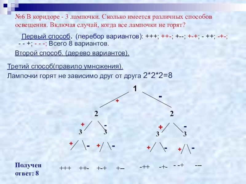 Первый способ. (перебор вариантов): +++; ++-; +--; +-+; - ++; -+-; - - +; - - -; Всего 8 вариантов.