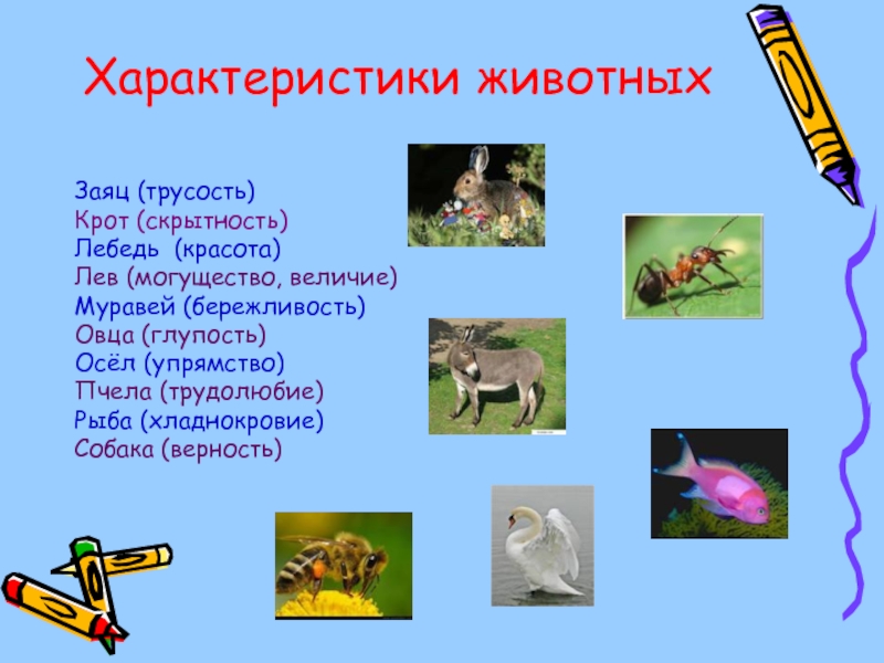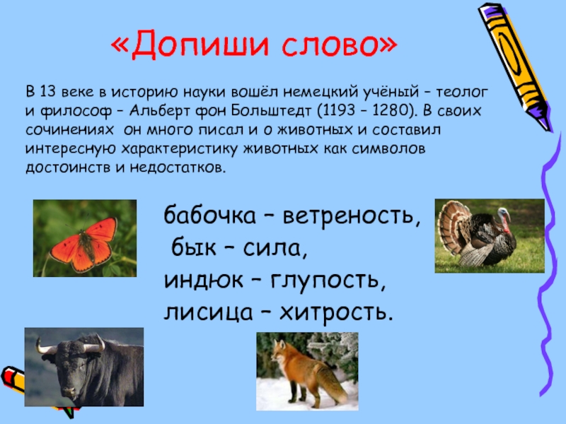 В 13 веке в историю науки вошёл немецкий учёный – теолог и философ – Альберт фон Больштедт (1193 – 1280). В своих сочинениях он много писал и о животных и составил интересную характеристику животных как символов достоинств и недостатков.