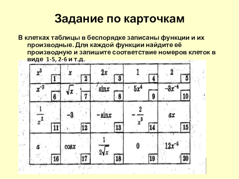 Задание по карточкамВ клетках таблицы в беспорядке записаны функции и их производные. Для каждой функции найдите её
