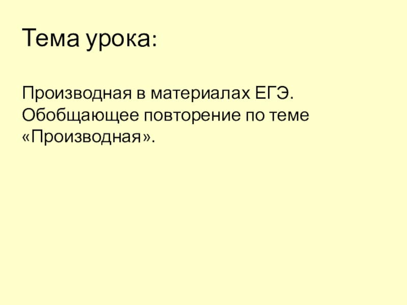Слайд 4Тема урока: Производная в материалах ЕГЭ. Обобщающее повторение по теме «Производная».