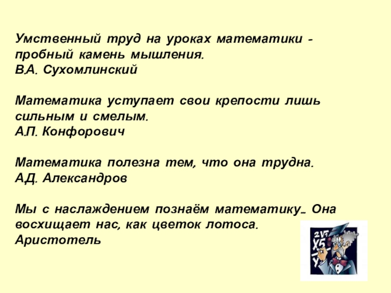 Умственный труд на уроках математики - пробный камень мышления. В.А. Сухомлинский Математика уступает свои крепости лишь сильным и смелым. А.П. Конфорович Математика полезна тем, что она трудна. А.Д. Александров Мы