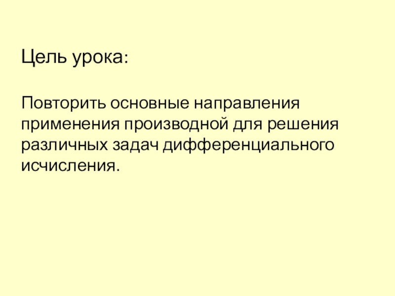 Цель урока:   Повторить основные направления применения производной для решения различных задач дифференциального исчисления.
