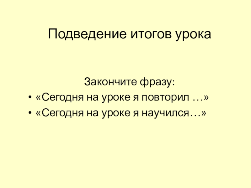 Подведение итогов урока Закончите фразу:«Сегодня на уроке я повторил …»«Сегодня на уроке я научился…»