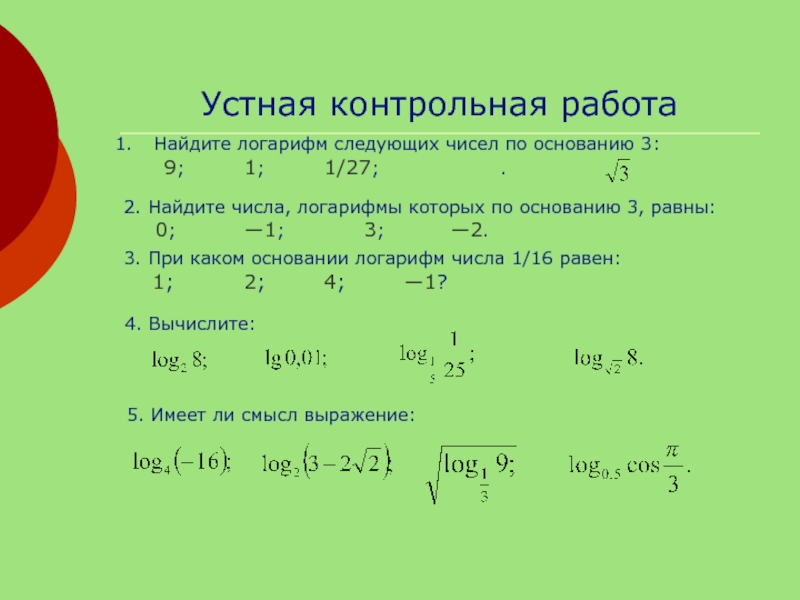 Устная контрольная работаНайдите логарифм следующих чисел по основанию 3:	9;		1;		1/27;		     .2. Найдите числа, логарифмы