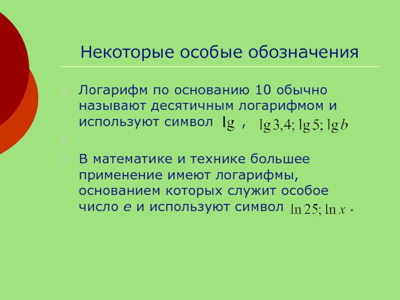 Некоторые особые обозначенияЛогарифм по основанию 10 обычно называют десятичным логарифмом и используют символ   , В
