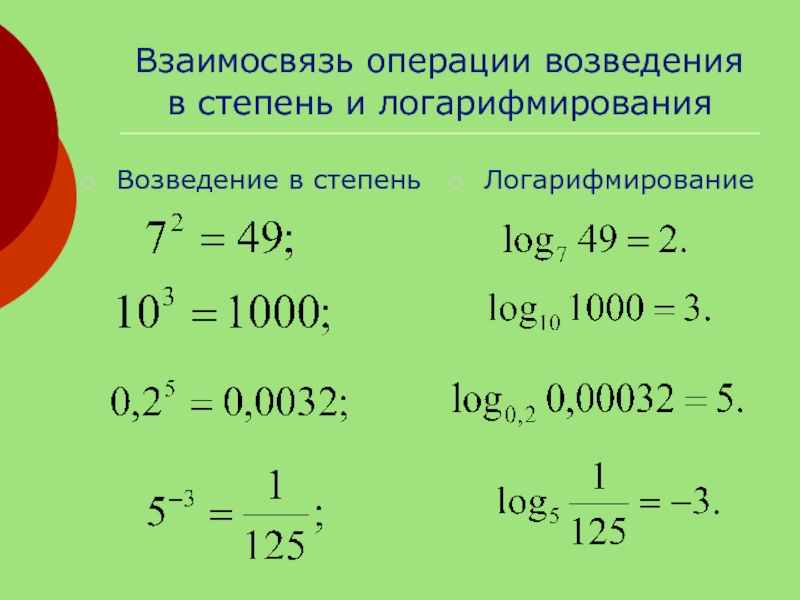 Взаимосвязь операции возведения в степень и логарифмирования Возведение в степеньЛогарифмирование