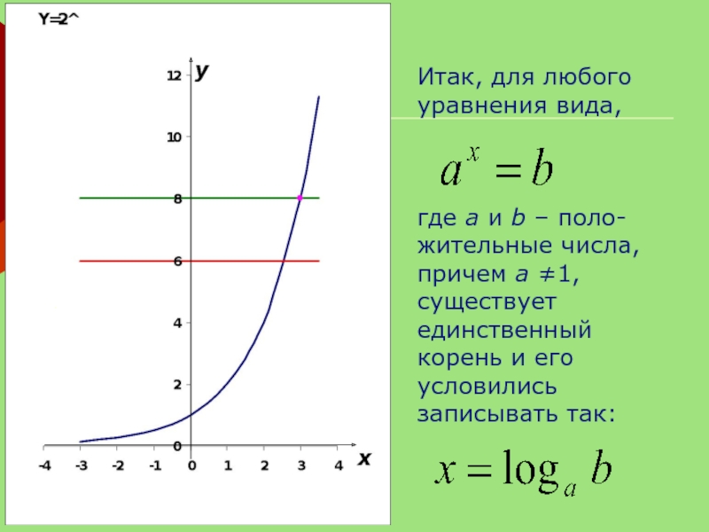 всегда можно в правой и левой частях уравнения привести выражения к одному основанию. Такие уравнения решаем графически и можем указать только приближенное значение корня уравнения.
