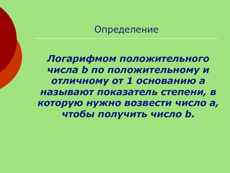 Определение Логарифмом положительного числа b по положительному и отличному от 1 основанию а называют показатель степени, в