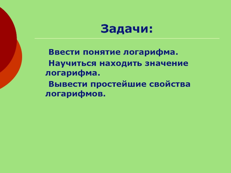 Задачи:	Ввести понятие логарифма.	Научиться находить значение логарифма.	Вывести простейшие свойства логарифмов.