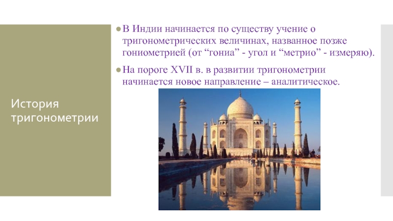 В Индии начинается по существу учение о тригонометрических величинах, названное