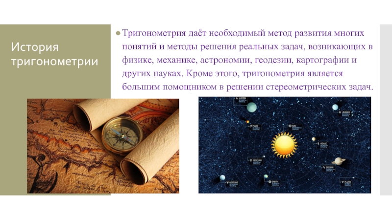 реальных задач, возникающих в физике, механике, астрономии, геодезии, картографии и других науках. Кроме этого, тригонометрия является большим помощником в решении стереометрических задач.