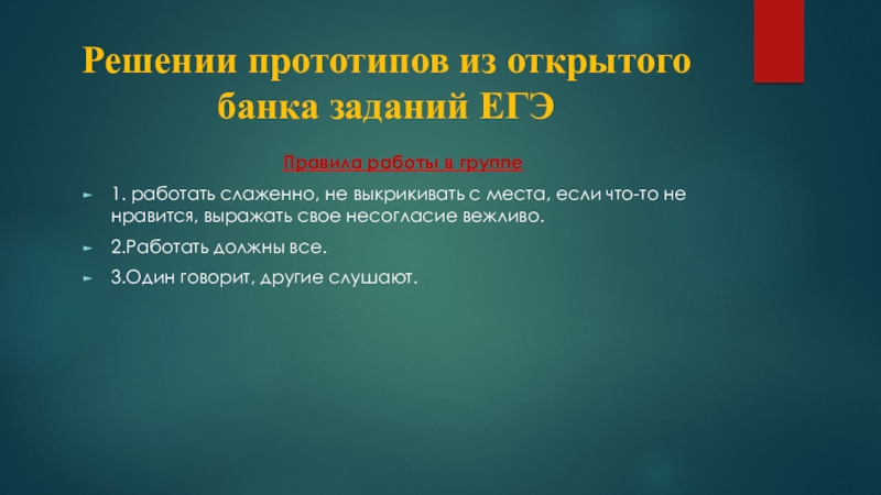Решении прототипов из открытого банка заданий ЕГЭПравила работы в группе1. работать слаженно, не выкрикивать с места, если