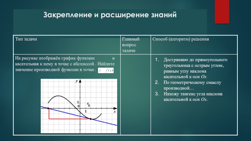 Закрепление и расширение знанийДостраиваю до прямоугольного треугольника с острым углом, равным углу наклона касательной к оси ОхПо
