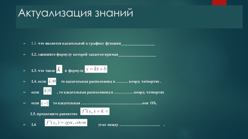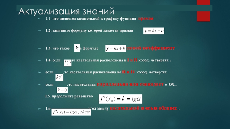 Актуализация знаний1.1. что является касательной к графику функции прямая1.2. запишите формулу которой задается прямая 1.3. что такое