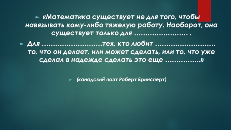 «Математика существует не для того, чтобы навязывать кому-либо тяжелую работу. Наоборот, она существует только для …………………… .Для ………………………тех, кто любит ……………………… то, что он делает, или может сделать, или то, что уже сделал в надежде сделать