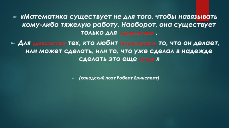 Слайд 3«Математика существует не для того, чтобы навязывать кому-либо тяжелую работу. Наоборот,
