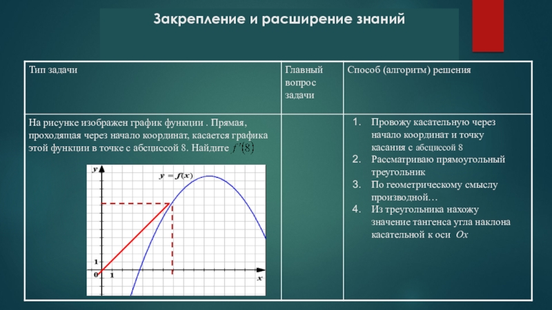 Закрепление и расширение знанийПровожу касательную через начало координат и точку касания с абсциссой 8Рассматриваю прямоугольный треугольникПо геометрическому
