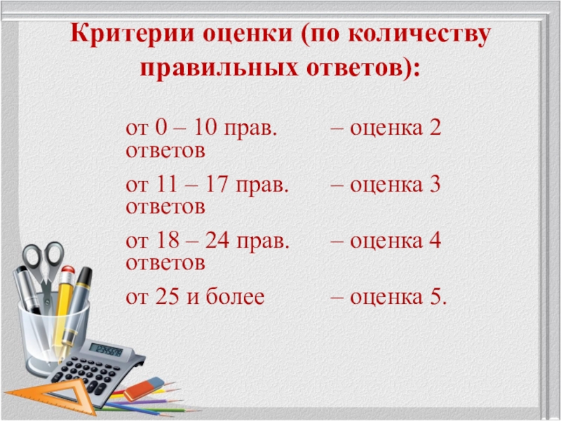 Слайд 3Критерии оценки (по количеству правильных ответов):