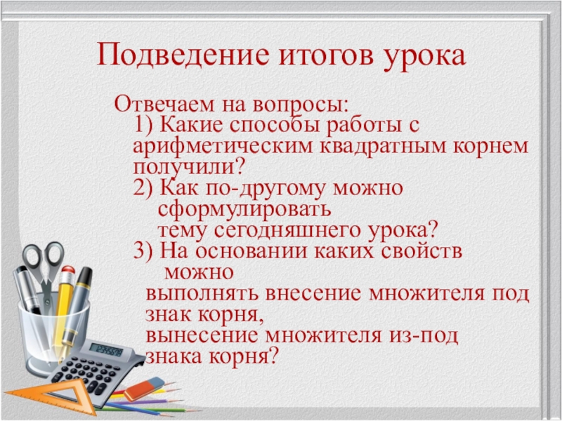 Подведение итогов урокаОтвечаем на вопросы:  1) Какие способы работы с  арифметическим квадратным корнем  получили?