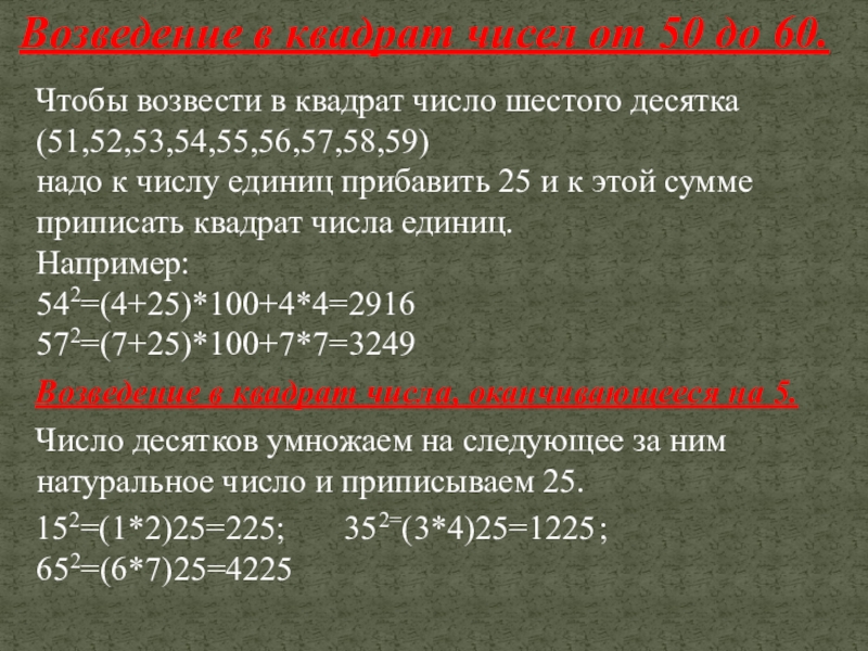Слайд 22Чтобы возвести в квадрат число шестого десятка (51,52,53,54,55,56,57,58,59)
