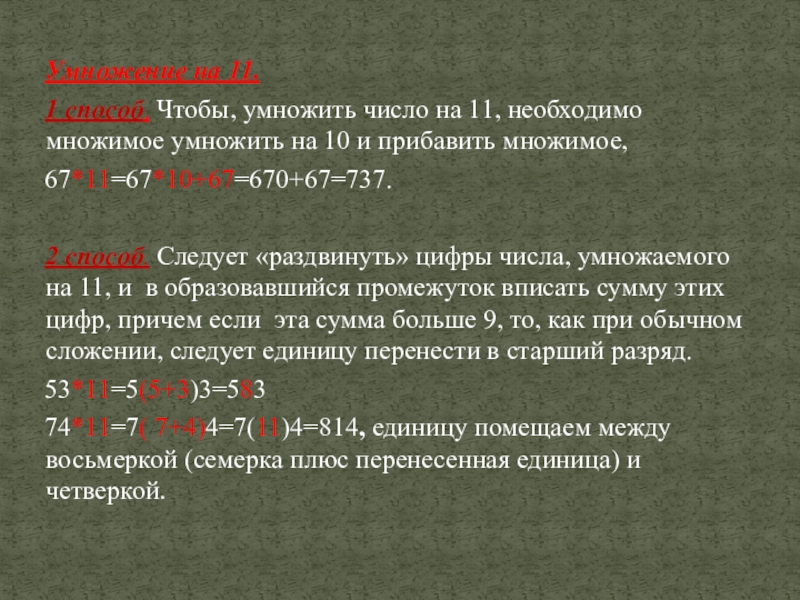2 способ. Следует «раздвинуть» цифры числа, умножаемого на 11, и в образовавшийся промежуток вписать сумму этих цифр, причем если эта сумма больше 9, то, как при обычном сложении, следует единицу перенести в старший разряд.