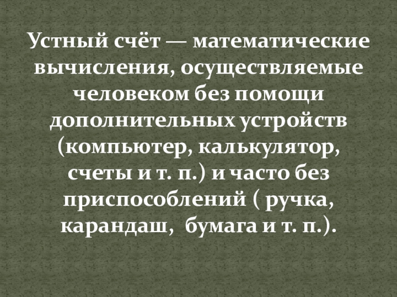 Слайд 3Устный счёт — математические вычисления, осуществляемые человеком без помощи дополнительных устройств (компьютер,