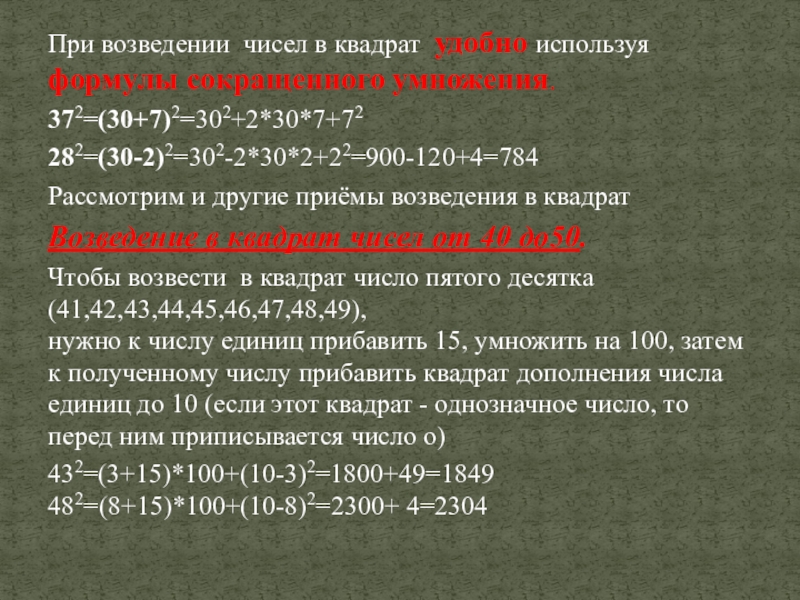 Слайд 21При возведении чисел в квадрат удобно используя формулы сокращенного умножения.