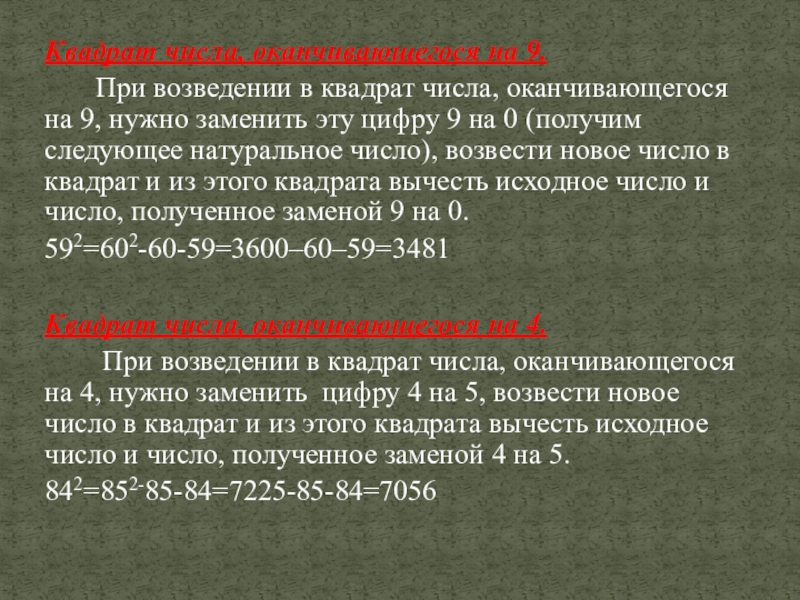 квадрат числа, оканчивающегося на 9, нужно заменить эту цифру 9 на 0 (получим следующее натуральное число), возвести новое число в квадрат и из этого квадрата вычесть исходное число и число, полученное заменой 9 на 0.