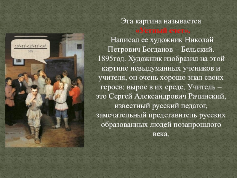 Петрович Богданов – Бельский. 1895год. Художник изобразил на этой картине невыдуманных учеников и учителя, он очень хорошо знал своих героев: вырос в их среде. Учитель – это Сергей Александрович Рачинский, известный русский педагог, замечательный представитель русских образованных людей позапрошлого века.