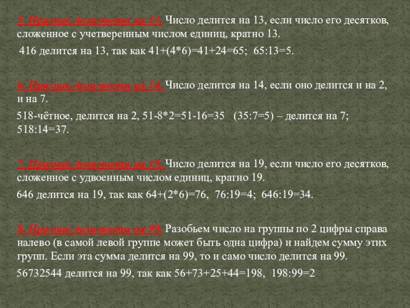 6. Признак делимости на 14. Число делится на 14, если оно делится и на 2, и на 7.