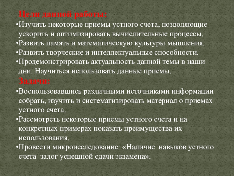 Изучить некоторые приемы устного счета, позволяющие ускорить и оптимизировать