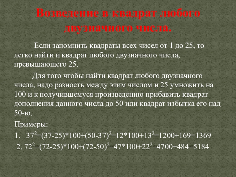 Для того чтобы найти квадрат любого двузначного числа, надо разность между этим числом и 25 умножить на 100 и к получившемуся произведению прибавить квадрат дополнения данного числа до 50 или квадрат избытка его над 50-ю.