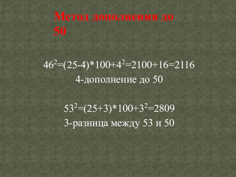 Слайд 19462=(25-4)*100+42=2100+16=2116
