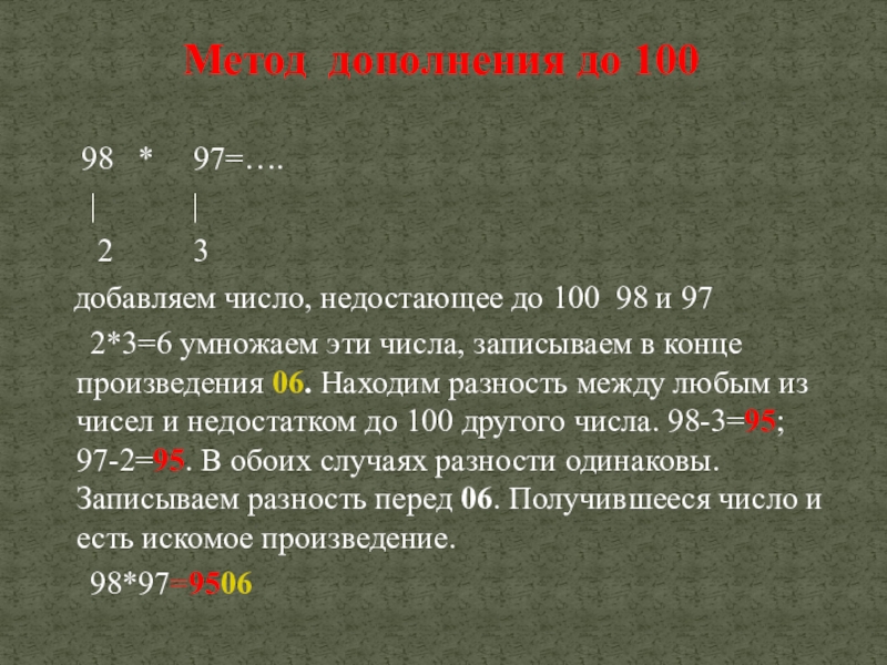 2*3=6 умножаем эти числа, записываем в конце произведения 06. Находим разность между любым из чисел и недостатком до 100 другого числа. 98-3=95; 97-2=95. В обоих случаях разности одинаковы. Записываем разность перед 06. Получившееся число и есть искомое произведение.