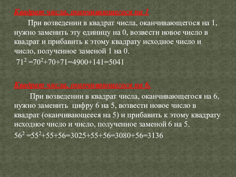 квадрат числа, оканчивающегося на 1, нужно заменить эту единицу на 0, возвести новое число в квадрат и прибавить к этому квадрату исходное число и число, полученное заменой 1 на 0.