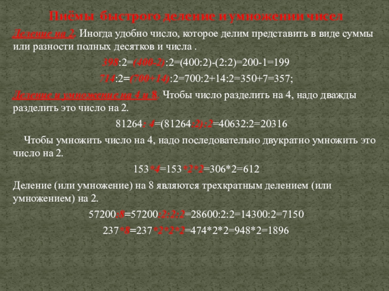 Слайд 14Пиёмы быстрого деление и умножении чисел