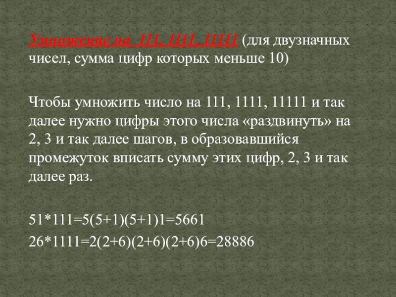 Чтобы умножить число на 111, 1111, 11111 и так далее нужно цифры этого числа «раздвинуть» на 2, 3 и так далее шагов, в образовавшийся промежуток вписать сумму этих цифр, 2, 3 и так далее раз.