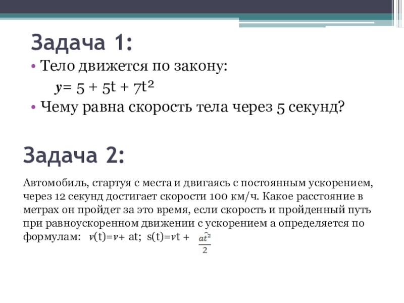 Автомобиль, стартуя с места и двигаясь с постоянным ускорением, через 12 секунд достигает скорости 100 км/ч. Какое расстояние в метрах он пройдет за это время, если скорость и пройденный путь при равноускоренном движении с ускорением a определяется по формулам: ?(t)=?+ at; s(t)=?t + ?