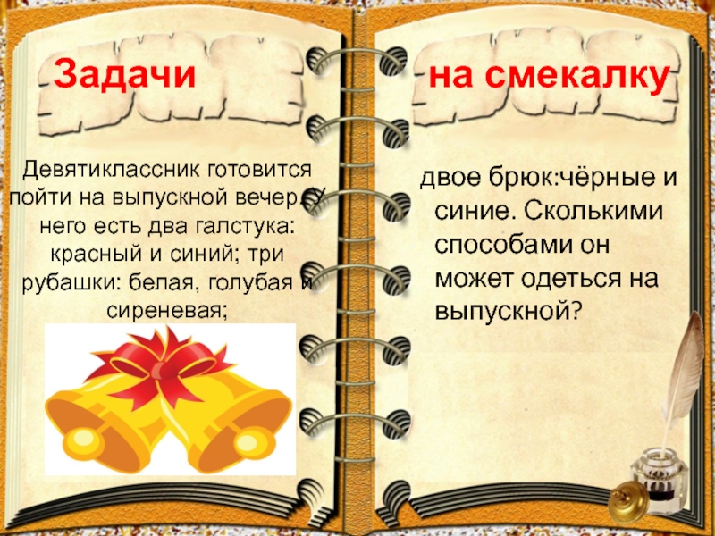 двое брюк:чёрные и синие. Сколькими способами он может одеться на выпускной?